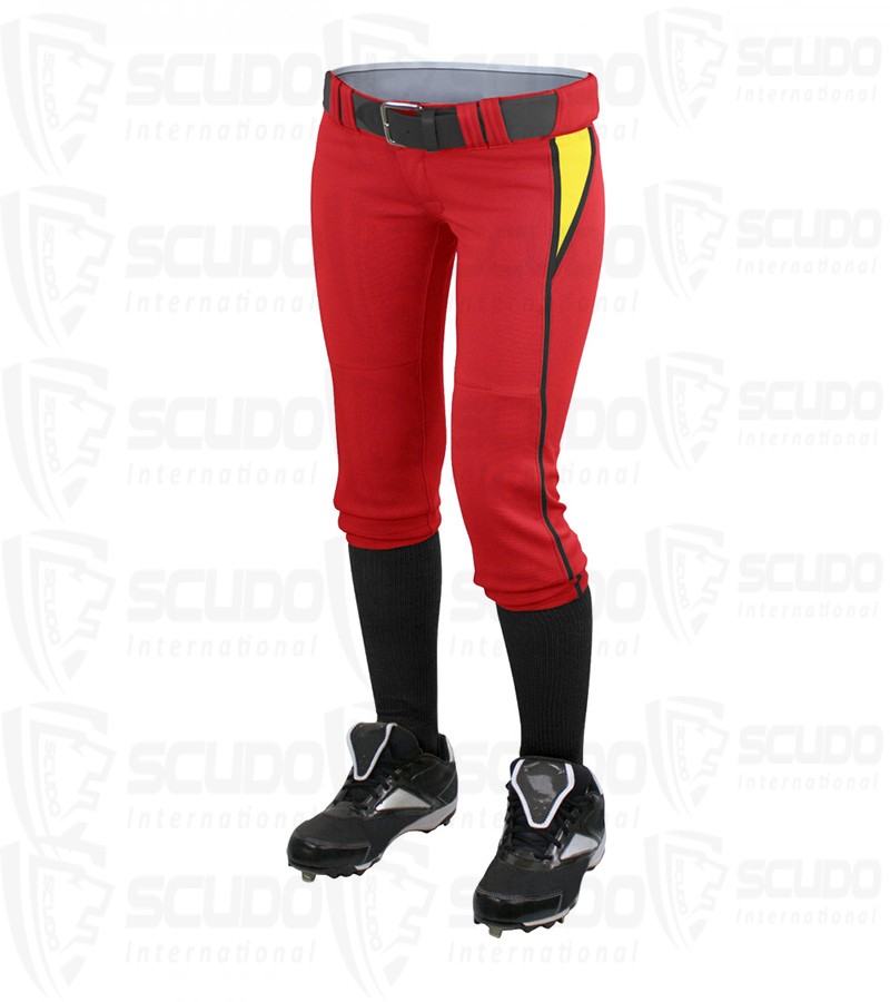 Our low-rise softball pants are featured here in 100% U.S. made Professional Weight Polyester and are shown with a customizable leg trim. It features an elastic waistband with 2 snap closure with brass zipper, double knees, and elastic hemline.